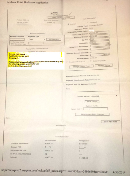 Hospitals want to make their cash register ring, too. In addition to folks like me who can and will pay, there are those who can’t and won’t, and those who can and don’t. If I had debts, the hospital would certainly be the last one on my list to pay, since they are prohibited by law from charging interest on unpaid balances. If the choice is between the MasterCard charging me 23.675% APR and the hospital charging me 0%, well, what person in their right mind would pay the hospital first? Hospitals know this. They have been around a long time…even longer than MasterCard. Their best chance of getting their money comes when they can get it up front. RevPoint knows this, too. The have a nefarious little segment on their form, and this form was meant to be used for a screen script, I think, and not to be handed the patient. It is shown in the photo below.