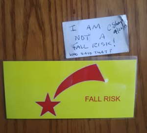 I had great fun with this sign that was posted to my door. Hemosapien made them take it down after he noticed the card I had posted adjacent to the sign. I was as much of a fall risk as anyone walking around on two feet. It was the source of much amusement for the nurses and visitors alike.