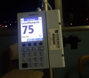 He was as unwilling to put me on prophylactic antibiotics as I was to take them, and I am allergic to penicillin, so cultures were required to determine what, if any, antibiotics may be needed. These cultures take time. Eventually, IV Levaquin was required, though I daresay I had a pretty severe reaction to it. I itched so bad I asked for a wire brush. Eventually some other medications alleviated my itching (I expect I got some heavy steriods) and I was well on my way to getting the medicine into my veins, particularly after they slowed down the delivery.
