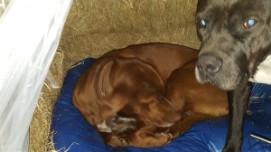 I keep a heat lamp out on my carport in the winter-time for her and Relay, but Ruby seldom gets under it. The heat lamp is Relay’s cold-weather domicile. She is as contented under that heat lamp as any dog laying out in the sun seems to be, which is pretty high on the contentment scale. The radiant heat is like a narcotic to a dog. They get drunk on it.